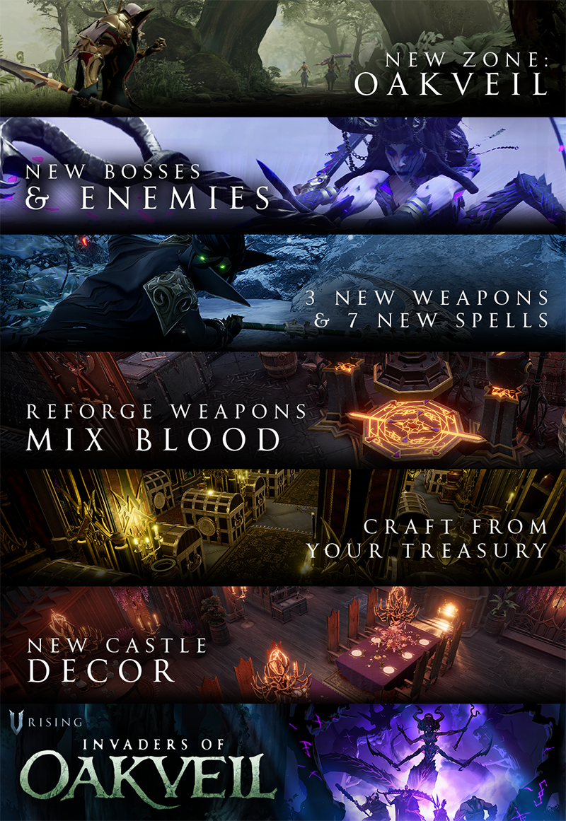 Catch up on everything new to V Rising on our website! Invaders of Oakveil is a major update and brings major changes to systems, new features, a new zone, a new enemy faction, and tons of quality-of-life mechanics we added based heavily on community feedback.